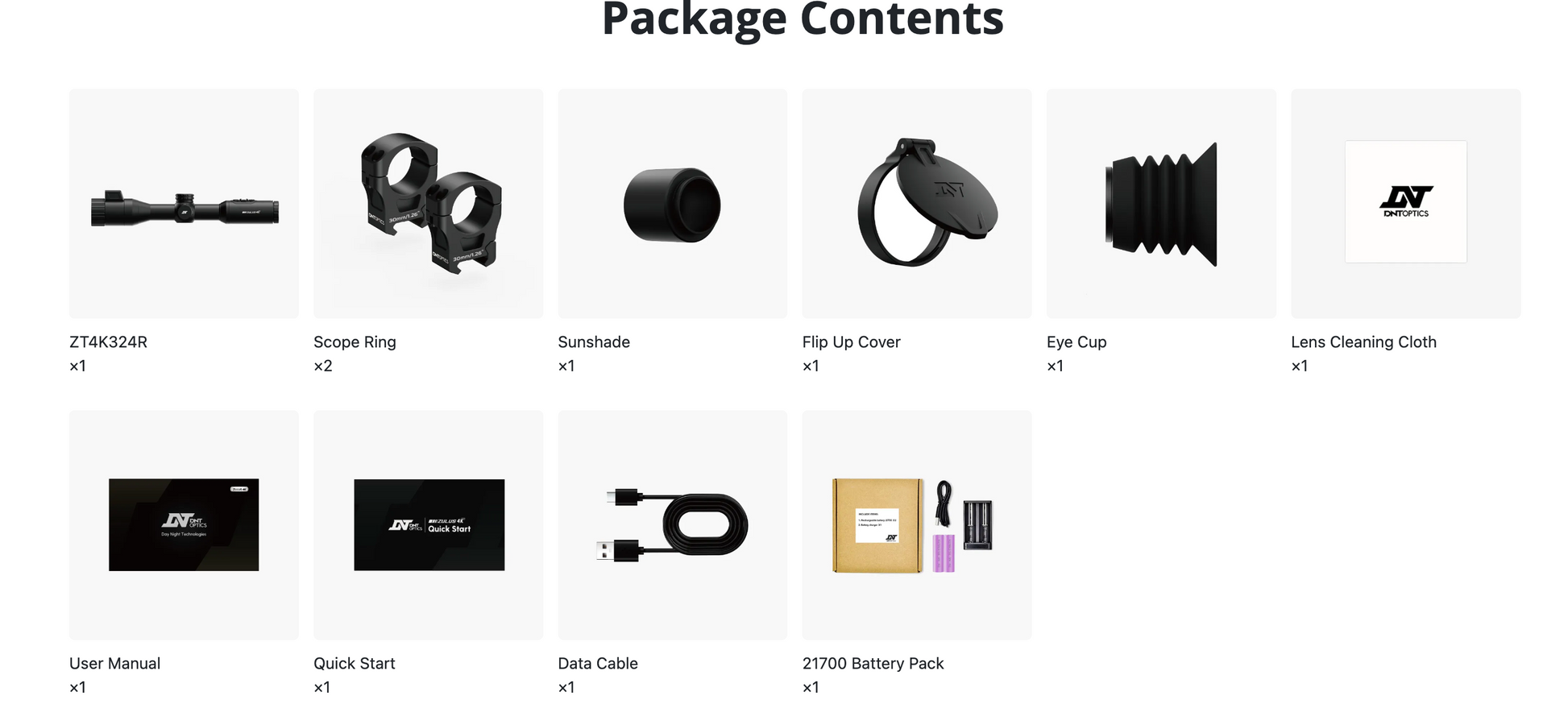 A: Yes. The ZULUS 4K comes with a pair of 30 mm - 1.26 in Rings and the matching wrench. Users can also couple their ZULUS 4K with other 30 mm rings. The package also includes a sunshade, an objective flip up cover, an eye cup, a lens cloth, and a data cable.